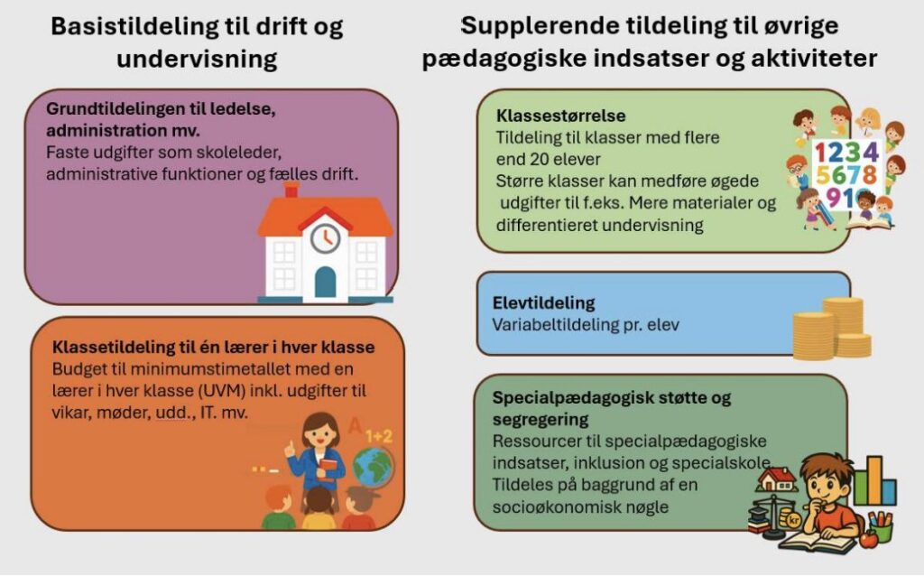 - Klassetildeling til én lærer pr. klasse (ca. 48 % af budgettet)